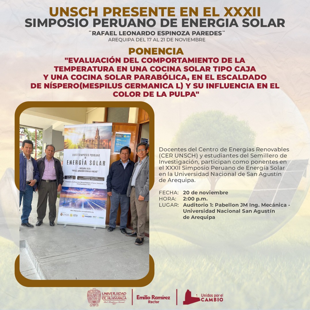 Felicitamos a los docentes del Centro de Energías Renovables (CER-UNSCH) y a los estudiantes del Semillero de Investigación, quienes representarán a nuestra casa de estudios como ponentes en el XXXII Simposio Peruano de Energía Solar, uno de los eventos académicos más relevantes del país en el campo de las energías renovables.