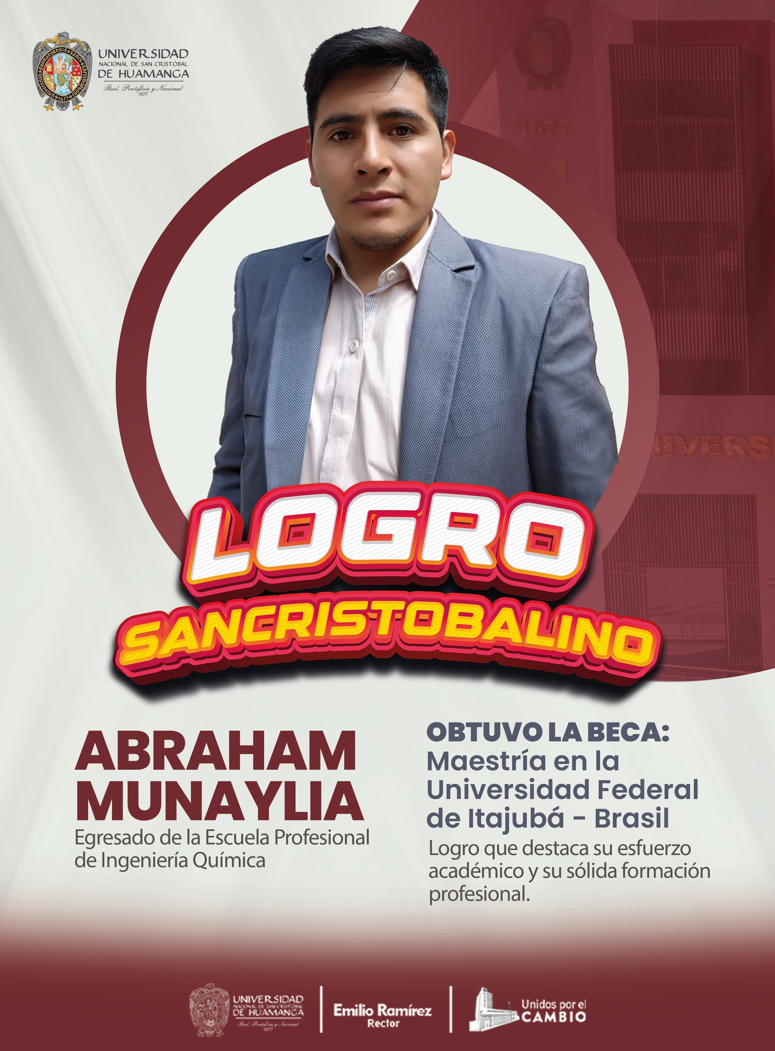 La Universidad Nacional de San Cristóbal de Huamanga felicita a Abraham Munaylia, egresado de la Escuela Profesional de Ingeniería Química, por haber obtenido una beca de maestría en la Universidad Federal de Itajubá – Brasil, logro que destaca su esfuerzo académico y su sólida formación profesional.