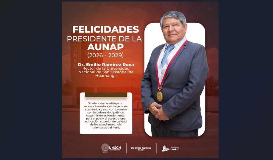 Con profundo orgullo institucional, la Universidad Nacional de San Cristóbal de Huamanga felicita a su rector, Dr. Emilio Ramírez Roca, por haber sido elegido democráticamente en la Asamblea General de Elección del Consejo Directivo como presidente de la Asociación de Universidades Nacionales del Perú – AUNAP (2026–2029), responsabilidad que reafirma su liderazgo, vocación de servicio y compromiso con el fortalecimiento de la universidad pública y la calidad de la educación superior en el país.