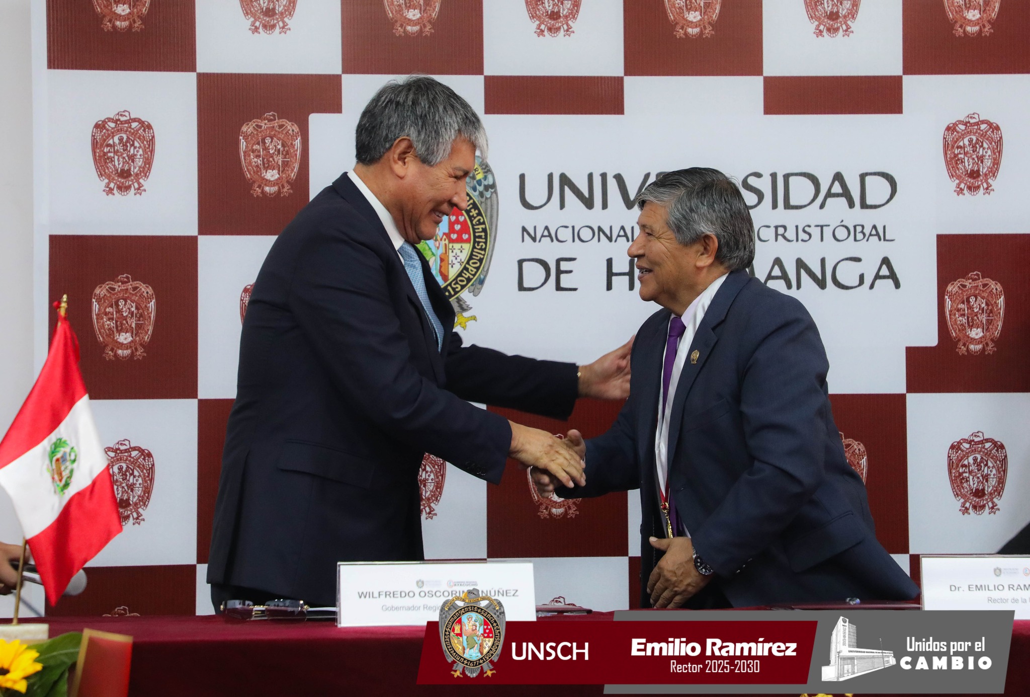 El acuerdo fue suscrito por el rector de la UNSCH, Dr. Emilio Germán Ramírez Roca, y el gobernador regional de Ayacucho, Wilfredo Oscorima Núñez, en la ciudad de Ayacucho.