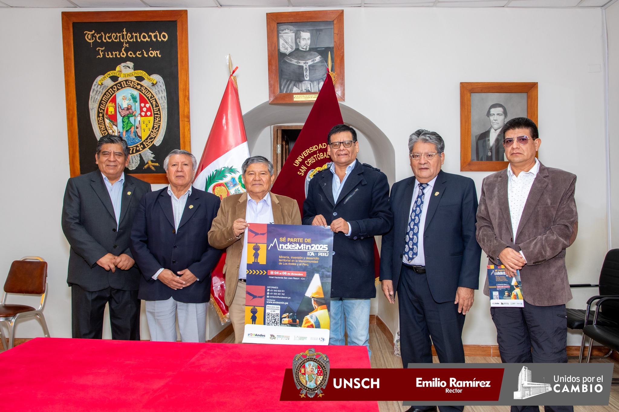 El rector de la Universidad Nacional de San Cristóbal de Huamanga, Dr. Emilio Ramírez Roca, junto al Dr. Hermes Bermúdez Valqui, vicerrector académico, y el Dr. José Quispe Tenorio, vicerrector de investigación, sostuvieron una reunión con los representantes de la Mancomunidad Regional de los Andes para coordinar las acciones necesarias que permitan la participación de los estudiantes de la Escuela Profesional de Minas en AndesMin 2025, que se desarrollará del 04 al 06 de diciembre en la región Ica.